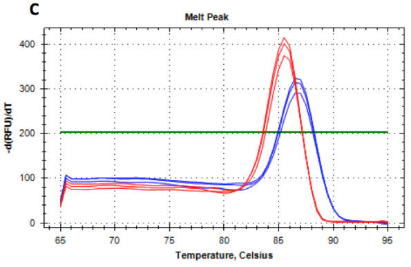圖3. 使用一步法RT-qPCR染料法熒光定量試劑盒,對(duì)HeLa細(xì)胞RNA提取物中GAPDH和Actin水平進(jìn)行分析,RNA提取物以10倍梯度稀釋成7個(gè)樣本,總量的范圍為100 ng至0.1 pg,并設(shè)無(wú)模板對(duì)照(NTC組)。 A.GAPDH的擴(kuò)增曲線(xiàn)(紅色); B.Actin的擴(kuò)增曲線(xiàn)(藍(lán)色); C.GAPDH(紅色)和Actin(藍(lán)色)擴(kuò)增片段的熔解曲線(xiàn)。