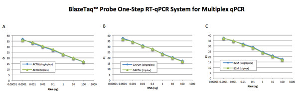 圖2. 使用BlazeTaq™ Probe One-Step RT-qPCR kit,對(duì)HeLa細(xì)胞RNA提取物中ACTB(A)、GAPDH(B)和B2M(C)水平進(jìn)行單通道和三通道分析,RNA提取物以10倍梯度稀釋成7個(gè)樣本,總量的范圍為100 ng至0.1 pg,結(jié)果顯示,單通道和三通道的擴(kuò)增效率相同。