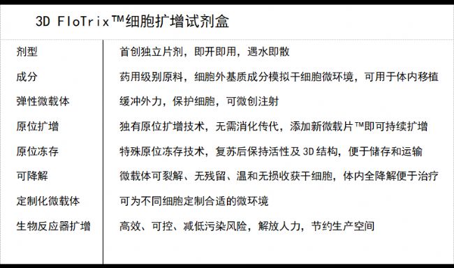 3D FloTrix™細(xì)胞擴(kuò)增試劑盒配合3D FloTrix™細(xì)胞大規(guī)模擴(kuò)增工藝(匯集一步接種、連續(xù)擴(kuò)增、原位凍存及溫和收獲等專利技術(shù)),通過(guò)生物反應(yīng)器程序化培養(yǎng),可實(shí)現(xiàn)定制化、自動(dòng)化、規(guī);、智能化的細(xì)胞大規(guī)模擴(kuò)增!3D TableTrix微載片™為全球?qū)@a(chǎn)品,由數(shù)萬(wàn)顆彈性三維多孔微載體組成, 孔隙率>90%,粒徑大小可控于50-500μm區(qū)間, 均一度≤100μm,且生化、物理性質(zhì)可定制,形成真正的3D仿生培養(yǎng)。