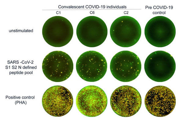 Purified PBMCs prepared from three individuals previously PCR-confirmed for SARS-CoV-2 and PMBC from one pre-COVID-19 healthy control were stimulated with Mabtech's SARS-CoV-2 S1 S2 N defined peptide pool (250,000 cells/well). PHA stimulation (50,000 cells/well) was used as positive control stimulus. Unstimulated cells (250,000 cells/well). The T cell response was analyzed on Mabtech IRIS using an IFN-γ/IL-2 FluoroSpot assay。