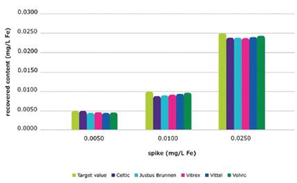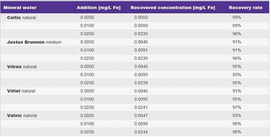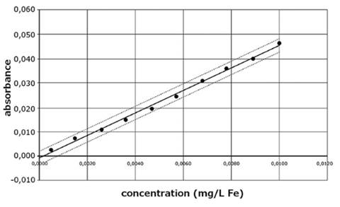 痕量級高靈敏度分析方法主要包括火焰原子吸收光譜法和電感耦合等離子體發(fā)射光譜法(ICP-OES)。根據(jù)相關(guān)標(biāo)準(zhǔn)中的限值,DIN EN ISO 404063中的火焰原子吸收光譜法的測量范圍為0.002–0.020 mg/L Fe。根據(jù)DIN EN ISO 11885中的ICP-OES方法的檢出限(LOQ)為0.002 mg/L Fe。使用ICP-MS方法,通常檢出限(LOQ)可達0.0007 mg/L Fe。