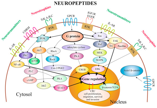 神經(jīng)肽(Neuropeptide)是神經(jīng)元相互交流的肽,是神經(jīng)元信號(hào)分子,以特定方式影響大腦和身體的活動(dòng)。神經(jīng)肽特點(diǎn)是含量低、活性高、作用廣泛而又復(fù)雜,在體內(nèi)調(diào)節(jié)多種多樣的生理功能,包括鎮(zhèn)痛,食物攝入,新陳代謝,繁殖,社交行為,學(xué)習(xí)和記憶。部分神經(jīng)肽既能以突觸釋放的方式實(shí)現(xiàn)調(diào)節(jié)作用,又能以非突觸釋放的方式對(duì)鄰近或較遠(yuǎn)部位的靶細(xì)胞活性進(jìn)行調(diào)節(jié)。