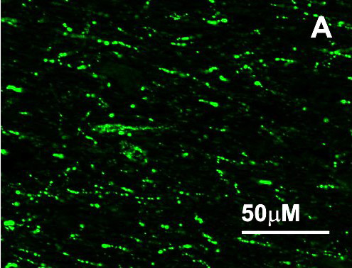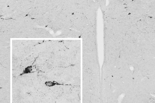 用豚鼠多抗(GP-1080-50;1:40,000)免疫組化檢測(cè)RFRP-3,然后用生物素化的二抗和鎳-二氨基聯(lián)苯胺顯色,產(chǎn)生RFRP-3 / GnIH的特異性標(biāo)記大鼠下丘腦背核中的神經(jīng)元及其過程。 |