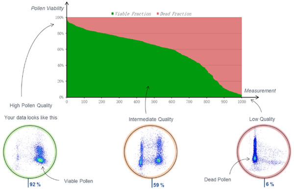 Ampha Z32花粉活力分析儀測量得到細(xì)胞散點云圖。如圖所示,圖中最左側(cè)樣本的花粉活性幾乎達(dá)到了100%,最右側(cè)樣本的花粉活性幾乎為0%,細(xì)胞散點云圖中清晰區(qū)分出活性細(xì)胞類群和失活細(xì)胞類群。對于第900-1000個樣本的花粉活性小于10%,不適用于育種或種子生產(chǎn),將直接被淘汰。
