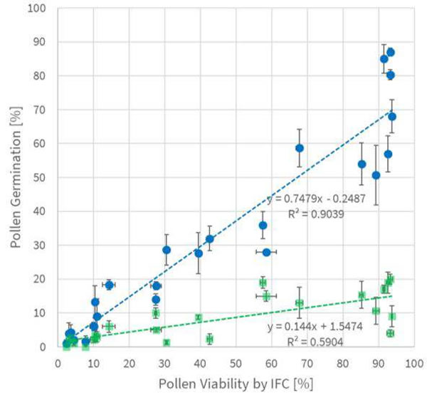 標(biāo)準(zhǔn)發(fā)芽瓊脂培養(yǎng)基(■)和改良的液體發(fā)芽緩沖液(●)。藍(lán)色和綠色虛線分別代表相應(yīng)的相關(guān)性方程和相關(guān)系數(shù),Y誤差線表示萌發(fā)法的標(biāo)準(zhǔn)偏差,X誤差線表示IFC法的標(biāo)準(zhǔn)偏差。