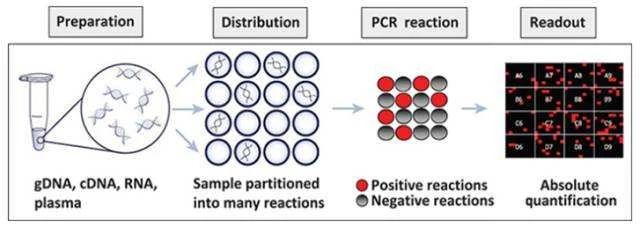 ▲數(shù)字PCR流程大致分為:樣品制備、目標(biāo)基因分配、RCR擴(kuò)增、結(jié)果讀出