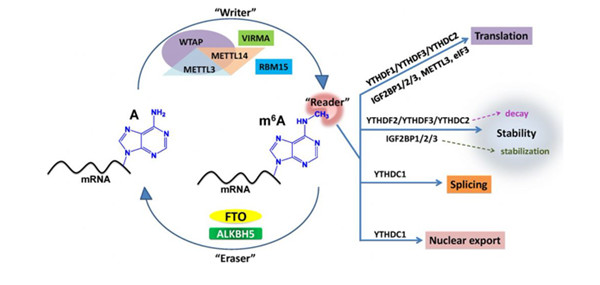 6-甲基腺嘌呤(m6A)是在存在于真核生物的RNA分子中最常見的和豐富的甲基化修飾和占所有RNA甲基化的80%以上。它可以被稱為“第五RNA堿基”并且在調(diào)節(jié)胚胎發(fā)育和細胞命運中具有廣泛的作用。