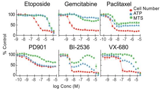 如上圖所示,HT29細(xì)胞被6種不同藥物處理48小時(shí)后用不同方法對(duì)細(xì)胞增殖進(jìn)行了分析。從生長(zhǎng)曲線來(lái)看,這三種方法得到的結(jié)果之間有不小的差異。比如Etoposide( 細(xì)胞周期特異性的抗腫瘤藥),雖然最高與最低劑量得到的殺傷效率分別相同,但細(xì)胞計(jì)數(shù)與另兩種方法的曲線趨勢(shì)完全不同,所得IC50也小得多。又比如Gemcitabine(DNA合成抑制劑), 細(xì)胞計(jì)數(shù)所測(cè)得的最高劑量殺傷效率比另兩種方法測(cè)得的要高得多?傮w來(lái)說(shuō),與細(xì)胞計(jì)數(shù)相比較時(shí),MTS和CellTiter-Glo會(huì)不同程度地低估藥物殺傷效率。