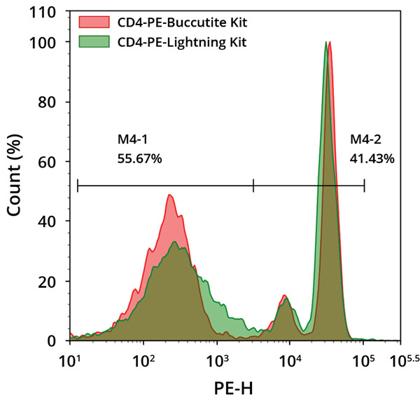 圖3. 人PBMC細(xì)胞的流式細(xì)胞儀分析。用Buccutite™快速PE抗體標(biāo)記試劑盒(目錄號:1310)或Lightning-Link®PE制備的抗人CD4抗體。使用ACEA NovoCyte流式細(xì)胞儀在FITC通道中監(jiān)測熒光信號