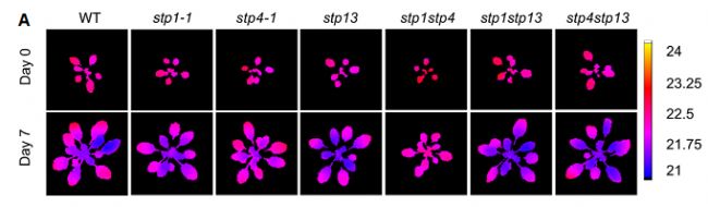 stp突變體造成擬南芥氣孔關(guān)閉后,最直接影響到的就是擬南芥的蒸騰作用,進(jìn)而使光照條件下的葉片溫度升高。紅外熱成像分析表明,各種