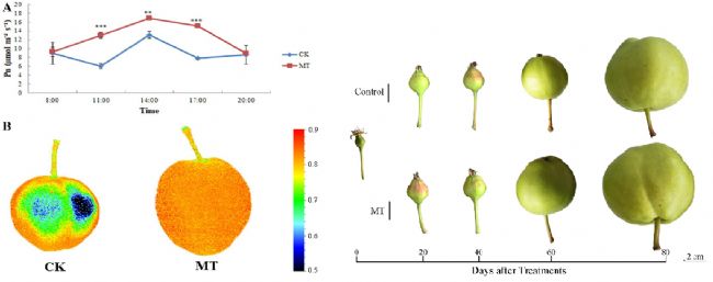 西北農(nóng)林大學(xué)的研究者們利用FluorCam葉綠素熒光成像,針對褪黑素對早酥梨果實生理特性的影響進行了探究(Jianlong Liu,2019)。結(jié)果表明,在果實膨大階段,褪黑素(MT)處理過的水果中最大光量子產(chǎn)量(Fv/Fm)保持在0.82左右,未處理過的水果(CK)中為0.73,褪黑素增強了梨果實的光合能力,提高了單果重量。