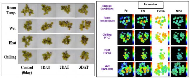 利用FluorCam葉綠素熒光成像鑒定葡萄果實新鮮度(YOO, 2015)。新鮮葡萄分別置于室溫、加濕、高溫、寒冷的環(huán)境下存儲,一定時間后分別檢測樣品葡萄光合狀態(tài)的變化。結(jié)果顯示,葡萄果實中Fv / Fm、ΦPSII和NPQ的數(shù)值變化在熱條件下高于其他條件。低溫(4°C)和潮濕條件可保持Fv / Fm值在0.8作用,生理狀態(tài)相對更加穩(wěn)定,可作為綠色葡萄果實的合適存儲方法。