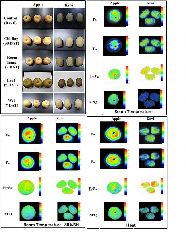 利用FluorCam評估室溫、高溫、高濕等不同儲存條件下保存的蘋果和獼猴桃的新鮮品質(zhì)(YOO, 2014)。研究表明,在熱脅迫下,蘋果和獼猴桃Fv / Fm、ΦPSII和NPQ的變化均高于其他脅迫下的變化。低溫(4°C)下其光合狀態(tài)則保持相對穩(wěn)定,此條件下保存的果實新鮮品質(zhì)較高。