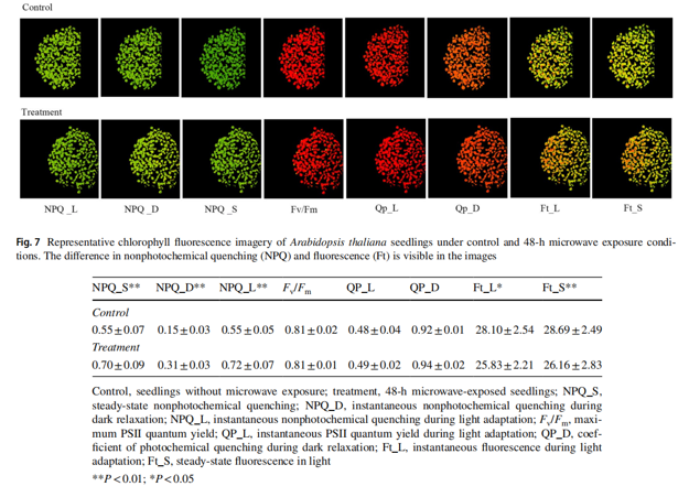 日本琦玉大學(xué)研究人員采用FluorCam葉綠素?zé)晒獬上窦夹g(shù),研究分析了2.45GHz頻段微波對擬南芥種子及種苗處理的影響,結(jié)合發(fā)芽率、幼苗過氧化物酶活性、光合色素含量、花青素含量數(shù)據(jù),結(jié)果表明,種子萌發(fā)后經(jīng)微波處理,NPQ(非光化熒光淬滅)升高、Ft降低,結(jié)合H2O2(過氧化氫)和光合色素分析結(jié)果(Chl b增多),認為微波處理的幼苗通過提高NPQ形式耗散過量光能以保護光系統(tǒng)免受損傷;Fv/Fm(反映光合效率)、QP(光化淬滅)無明顯變化,說明微波處理對光系統(tǒng)效率無顯著影響,CO