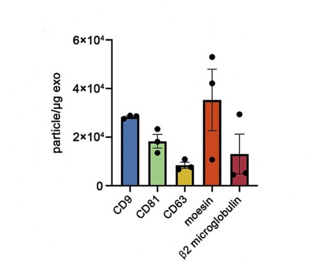 其中,研究人員使用單個外泌體表型分析技術(shù)(Exoview)對來源于人血漿的外泌體進行分析,成功檢測到了攜帶moesin和β2-microglobulin蛋白的外泌體(圖1),并對其進行了定量分析。