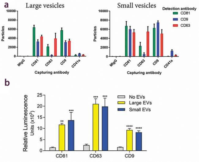 其中,研究人員將來源于黑色素瘤組織的不同離心轉(zhuǎn)速分離出來的外泌體,分為large與small兩種。對兩種外泌體,ExoView和ELISA方法都檢測到了CD9,CD63和CD81三種蛋白標記物(圖2a&b)。而Exoview方法同時檢測出了來源于血小板的標記物CD41a,標志著樣本受到微量來源于血液的外泌體污染。