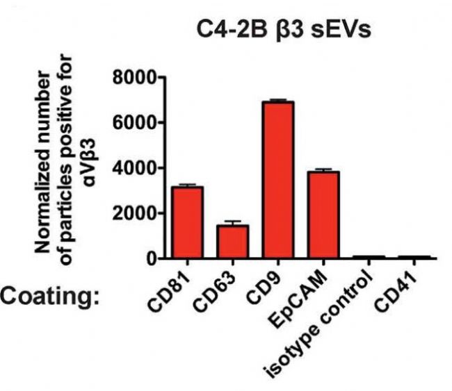 其中,研究人員使用ExoView檢測分離出的sEV是否含有αVβ3。結(jié)果表明,對于能夠與αVβ3形成配體的蛋白標記物(除CD41)使用相應(yīng)抗體而捕獲到的外泌體,均含有αVβ3(圖3);而對于不與αVβ3形成配體的CD41則沒有檢測到含有αVβ3的外泌體。