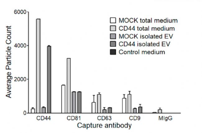 其中,研究人員使用Exoview檢測了MKN74細胞的未經(jīng)純化的培養(yǎng)基及分離純化后的外泌體中的含CD44以及其他標記物的含量。結(jié)果表明,相對于對照組,MOCK(CD44敲除)細胞組在未經(jīng)純化的培養(yǎng)基及分離純化后的分泌外泌體的數(shù)量顯著降低。以上結(jié)果表示ExoView可以直接對復(fù)雜環(huán)境的培養(yǎng)基進行檢測,無需分離純化步驟,且檢測結(jié)果具有極高特異性。