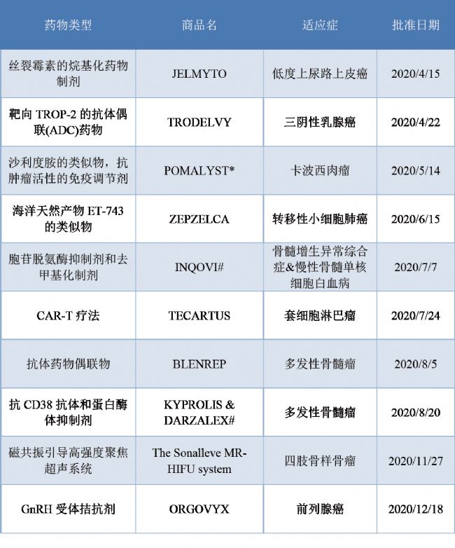 縱觀2020年FDA審批通過的其他抗腫瘤藥物,共有9種新藥,1種擴大藥物適應(yīng)癥,2種需與其他藥物聯(lián)合療法。值得一提的是,UroGen制藥公司的JELMYTO,是一種首創(chuàng)的藥物,是第一個也是唯一一個被用于治療低級別上尿路上皮癌的非手術(shù)治療方法。以往的患者需要完全切除腎臟、輸尿管和膀胱袖口進行根治性手術(shù)治療,而這個方法讓患者有一種無手術(shù)的替代選擇。Astex制藥公司的INQOVI,是首個口服的低甲基化制劑,此次的批準(zhǔn)為MDS和CMML患者帶來一種新的治療選擇,Inqovi是由固定劑量的cedazuridine(一種胞苷脫氨酶抑制劑)和地西他濱(一種已獲批的抗癌DNA去甲基化劑)組成的一種新的口服組合療法。其中,cedazuridine組分能夠抑制腸道和肝臟中的胞苷脫氨酶,避免降解地西他濱,從而使Inqovi能夠?qū)崿F(xiàn)口服給藥地西他濱,達到與地西他濱靜脈輸注同等的暴露當(dāng)量。通過空腹口服組合藥物,減輕這些患者每月的靜脈滴注負(fù)擔(dān)。我們期待在2021年能在現(xiàn)有藥物擴大適應(yīng)癥的同時,審批通過更多有價值的新型抗腫瘤藥物。