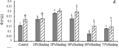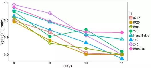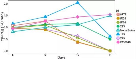 4)耐低光照品種篩選,定時(shí)測(cè)量植株的潛在最大光能利用效率(Fv/Fm)、光照條件下實(shí)際的光能利用效率(Y(II))和植株吸收光能后熱耗散能力指標(biāo)(NPQ)。結(jié)果顯示,耐光照品種,F(xiàn)v/Fm和Y(II)略微升高,NPQ下降。