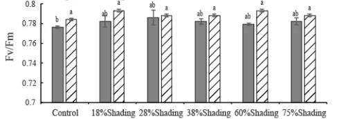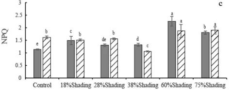 不同遮光條件下,F(xiàn)v/Fm、Y(II)和NPQ的響應(yīng)