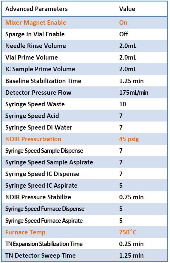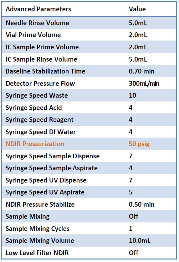兩個使用靜壓濃度(SPC)技術(shù)的儀器被配置用于分析從不同的湖泊和池塘收集的樣品中的TOC,每臺儀器分別采用飲用水分析的方法參數(shù)(表2和表3)。