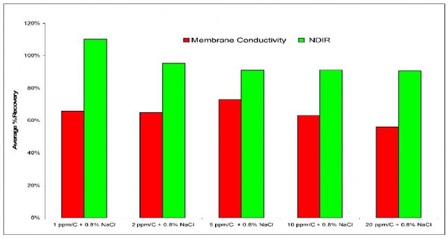 Figure 1 在0.8% NaCl條件下,隨著TOC濃度的增加,兩臺分別采用膜電導率和NDIR檢測技術(shù)的TOC分析儀的比較。在分析之前,每個分析儀都根據(jù)其制造規(guī)格進行校準