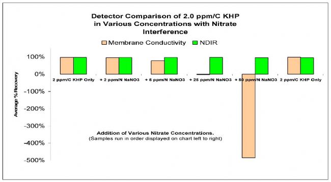 對比圖1中0.8%氯化鈉濃度下的鹵水樣品,可以看出NDIR檢測的優(yōu)越性。NDIR檢測器遠遠超過膜電導率檢測分析鹽水的能力。圖2顯示,難以氧化的藥物化合物 (由于它們復雜的分子結(jié)構(gòu)和不同的氮、硫和碳含量) 的比較。如所示,與NDIR檢測器相比,膜電導率檢測器不能有效地回收這些化合物。圖3和圖4表明,隨著氮濃度的增加,樣品中的氮化學物質(zhì) (及其各自的氧化產(chǎn)物) 對膜的電導率TOC回收率有負影響。相比膜電導率技術(shù),NDIR檢測技術(shù)在所有的化合物分析以及廣泛的水樣品基質(zhì)分析中,表現(xiàn)出優(yōu)越的回收率和精度。