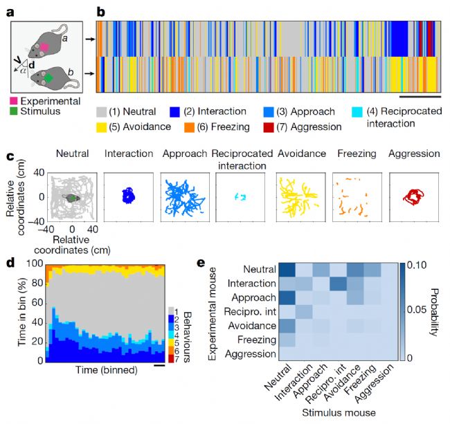 為了捕捉自然的社交行為,作者建立了一個(gè)行為范式,在實(shí)驗(yàn)小鼠短期適應(yīng)環(huán)境后,允許兩只自由行為的小鼠在一個(gè)中性環(huán)境中互動(dòng)8-9分鐘。在直接從行為追蹤過(guò)程中提取的參數(shù)(圖1a)的基礎(chǔ)上,作者檢測(cè)到五種不同的社會(huì)行為:接近、發(fā)起互動(dòng)、交互互動(dòng)、逃避和攻擊,以及凍結(jié)狀態(tài)。凍結(jié)狀態(tài)是由非社會(huì)線索和社會(huì)線索引起的(分別占總時(shí)間的1.6±0.3%和2.5±0.4%;配對(duì)t檢驗(yàn),t18 = 1.9, P = 0.06, n = 19只小鼠)。作者使用術(shù)語(yǔ)“中性行為”來(lái)指代小鼠不參與任何這些行為,但正在探索環(huán)境或自我梳理的時(shí)間,這導(dǎo)致了兩個(gè)小鼠行為的連續(xù)表征(圖1b)。小鼠最初表現(xiàn)出較高的凍結(jié)水平,然后迅速下降,然后在整個(gè)實(shí)驗(yàn)過(guò)程中保持在較低水平。小鼠在社交的前2分鐘中花費(fèi)了22.0±3.5%的時(shí)間進(jìn)行互動(dòng),隨后在社交的最后2分鐘下降到了11.8±1.8%(圖1d)?偟膩(lái)說(shuō),小鼠表現(xiàn)出很少的攻擊行為,社會(huì)互動(dòng)通常是相互發(fā)起的,往復(fù)的或引發(fā)的回避行為(圖1e),這表明,自然的社交行為實(shí)驗(yàn)條件下,社交互動(dòng)具有積極和消極的價(jià)值。