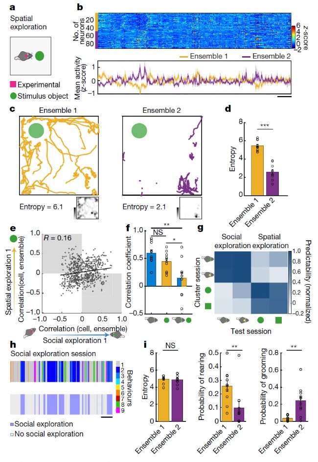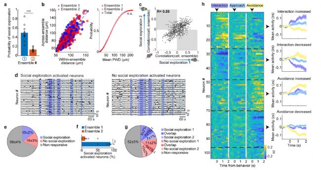 與重復(fù)的空間或社交探索的穩(wěn)定性相比,在空間和社交探索實(shí)驗(yàn)中,單個(gè)神經(jīng)元活動(dòng)和群體平均活動(dòng)之間的相關(guān)性僅有微弱關(guān)系(圖5e,f),神經(jīng)元同時(shí)成為空間探索和社交探索組合群體的概率與機(jī)會(huì)沒(méi)有顯著差異(圖5e)。發(fā)現(xiàn),在社交探索過(guò)程中檢測(cè)到的高度預(yù)測(cè)社交探索行為的神經(jīng)元集合與空間探索行為無(wú)關(guān),反之亦然(圖5g)。