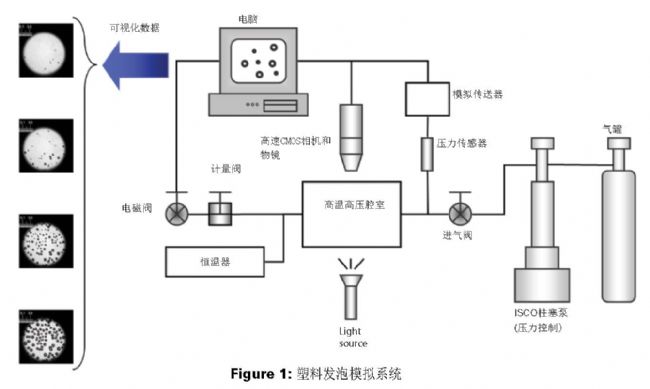 在下一頁(yè),圖1展示了郭等人開(kāi)發(fā)的間歇發(fā)泡可視化系統(tǒng)示意圖,實(shí)驗(yàn)發(fā)泡模擬系統(tǒng)由高溫高壓室組成,每個(gè)發(fā)泡試驗(yàn)都要密封一個(gè)小塑料樣品。腔室內(nèi)的溫度和壓力由帶有PID反饋控制的電加熱器和通過(guò)Teledyne ISCO柱塞泵的計(jì)量氣體供應(yīng)。該腔室配有兩個(gè)藍(lán)寶石窗口,以便觀測(cè)塑料樣品。一套包含高速攝像機(jī)與高倍率變焦耦合安裝透鏡的光學(xué)系統(tǒng)和光纖傳輸光源,用來(lái)在發(fā)泡過(guò)程中對(duì)塑料樣品進(jìn)行明亮的現(xiàn)場(chǎng)觀察和視頻記錄。系統(tǒng)中集成了一個(gè)計(jì)算機(jī)系統(tǒng),用來(lái)控制排氣閥的開(kāi)啟,觸發(fā)高速攝像機(jī),并預(yù)先設(shè)定傳感器記錄數(shù)據(jù)。