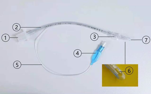 ①接頭-連接麻醉機(jī)供氣系統(tǒng);②導(dǎo)管;③套囊-密閉氣道、避免誤吸、固定導(dǎo)管、保護(hù)氣管(保持導(dǎo)管位于氣道中央,避免尖端損傷氣道);④測(cè)試球囊-給套囊充氣,可判斷充氣是否合適;⑤充氣連接管;⑥Murphy孔-可以防止導(dǎo)管尖端意外貼于氣管壁時(shí)發(fā)生通氣堵塞;⑦尖端。導(dǎo)管外壁標(biāo)識(shí),ID為導(dǎo)管內(nèi)徑(mm);OD示值為導(dǎo)管外徑(mm);刻度(cm)10、12、14、16、18…表示導(dǎo)管尖端到刻度的距離,提示導(dǎo)管插入深度。