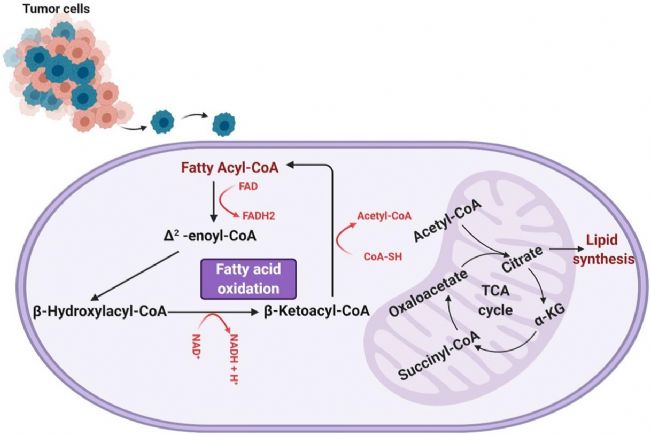 脂肪酸氧化涉及通過去除兩個碳乙酰基-CoA亞基并生成一個NADH和一個FADH來縮短;-CoA分子循環(huán),重復這種縮短;o酶A的過程,直到;o酶A完全分解或直至丙;o酶A的三碳結(jié)構(gòu)為止,該結(jié)構(gòu)可以轉(zhuǎn)化為琥珀;o酶A并進一步用于TCA循環(huán)。NADH和FADH2的單位有助于線粒體中的電子傳遞鏈,通過氧化磷酸化將其消耗以進一步產(chǎn)生ATP。如圖1所示,脂肪酸氧化是一種重要的能量來源,每單位質(zhì)量產(chǎn)生的ATP比糖原分解多6倍,且脂肪酸氧化的活性在GBM中已被證明有助于有氧呼吸,參與脂肪酸氧化的酶,特別是肉堿棕櫚;D(zhuǎn)移酶和長鏈酰基輔酶A脫氫酶,已被發(fā)現(xiàn)在人腦膠質(zhì)瘤組織中上調(diào)。