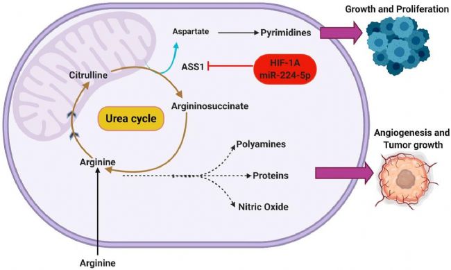 ASS1沉默在上述癌癥表型中具有優(yōu)勢,抑制ASS1被認為是將上游底物轉(zhuǎn)移到其他代謝途徑的有效機制。Rabinovich等人假設(shè)在常氧條件下ASS1沉默可促進細胞增殖所必需的合成代謝功能,由于天冬氨酸同時作為精氨酸和嘧啶合成的底物,ASS1的下調(diào)被認為使氨基酸轉(zhuǎn)向從頭合成嘧啶,并在ASS1沉默癌細胞中增加CAD(磷酸合成酶2、天冬氨酸轉(zhuǎn)氨甲酰酶和二氫乳清酸酶)活性進一步證明,CAD作為一種三功能酶主要調(diào)控嘧啶從頭合成的起始,表明CAD抑制對ASS1沉默細胞增殖的抑制作用。