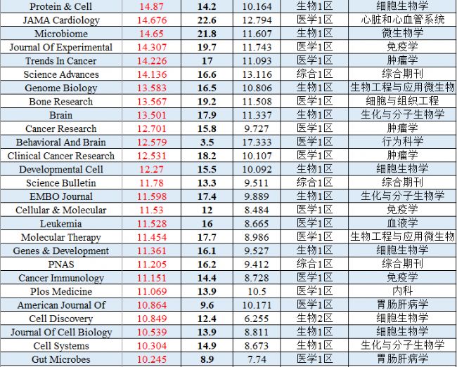 Cell Research作為國產(chǎn)期刊的老大繼去年突破20分大關(guān)后,今年繼續(xù)走高,相信未來可期;中科院昆明植物研究所的Fungal Diversity緊隨其后,終于破了20分關(guān)口;生物/醫(yī)學(xué)領(lǐng)域期刊大于10分的更是超過10個,今年發(fā)到這些期刊的小伙伴一定是做夢都能笑醒的!