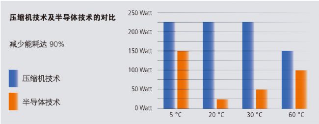 半導(dǎo)體技術(shù)與使用壓縮機(jī)相比,在運(yùn)行時(shí)振動(dòng)很小且安靜,比壓縮機(jī)制冷技術(shù)節(jié)省多達(dá)90%的能耗,如下圖所示。