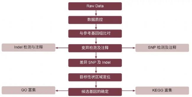 測序拿到原始數(shù)據(jù)后,可通過質(zhì)控、與參考基因組比對、SNP calling 等步驟得到各樣本 SNP 標記分型信息。對于重測序而言,無論是 BSA 還是其他性狀定位方法,SNP 分型信息是后續(xù)分析的基礎(chǔ)。