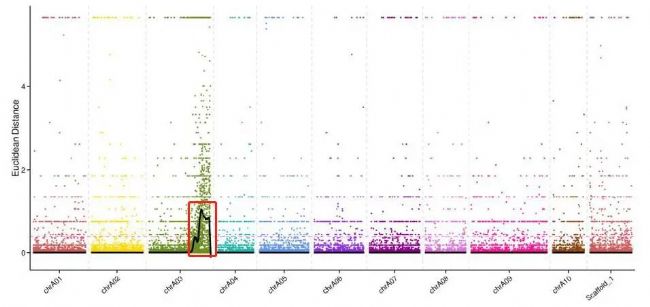 標記與性狀進行關(guān)聯(lián)是性狀定位最核心的部分,對于 BSA 而言,有兩種關(guān)聯(lián)方法,一種是 ΔSNP-Index,一種是歐式距離(Euclidean distance, ED)。
