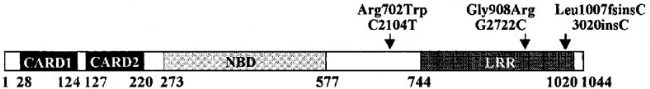 圖1. Nod2基因的結(jié)構(gòu)和克羅恩病相關(guān)變異體的定位[2]