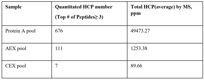 在經(jīng)過一步ProteinA純化后的樣品中,鑒定到676個具有定量信息的HCP(peptide≥3,下同);再經(jīng)過一步陰離子交換色譜(AEX)純化后,HCP數(shù)目下降至111;在此基礎上再進行一步陽離子交換色譜(CEX)純化后,僅檢測到7個HCP。三個樣品中定性及定量的HCP數(shù)目請見表1。