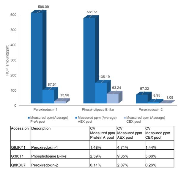 對于會引起免疫響應、降解蛋白或輔料的高風險HCP是科學家們在產(chǎn)品工藝的優(yōu)化過程中尤為注意的。圖2展示了隨著純化步驟的增多,高風險HCP數(shù)目呈減少趨勢。圖3展示了經(jīng)過三步純化后依然能夠鑒定到的三個高風險HCP及其各自的含量。