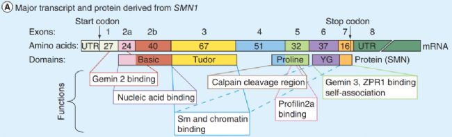 圖2. SMN1結(jié)構(gòu)。圖中顯示人類SMN1成熟的mRNA和蛋白線性化的結(jié)構(gòu)區(qū)域。箭頭指示的是翻譯起始和終止位點(diǎn)。不同區(qū)域內(nèi)部的數(shù)字表示氨基酸數(shù)量。下方則是對該基因的不同功能區(qū)進(jìn)行注釋。信息來源:10.4155/FMC.14.63.