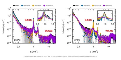 例如,在來(lái)自意大利拉奎拉大學(xué)和意大利羅馬大學(xué)的科學(xué)家最近發(fā)表的一篇文章中,SAXS 與其他表征方法一起用于研究喹啉在由不同脂質(zhì)組成的脂質(zhì)體中的負(fù)載量 [3]。喹啉是一種眾所周知的通用化合物,但溶解度低限制了其對(duì)藥理學(xué)應(yīng)用的影響,這可以通過(guò)將其包含在脂質(zhì)體中來(lái)克服。下圖顯示了具有不同喹啉配方的喹啉負(fù)載多層囊泡和由不同磷脂(DOPC、DPPC)制成的脂質(zhì)體的 SAXS 和 WAXS 測(cè)試結(jié)果。清晰的周期性散射峰證實(shí)了具有所需層狀度的囊泡的存在。載有喹啉7的DPPC脂質(zhì)體是一個(gè)例外。在這里,寬的散射峰表明存在堆疊雙層數(shù)量少得多的脂質(zhì)體。