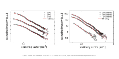 除了雙層形態(tài)研究外,SAXS 還可用于表征從幾納米到幾百納米范圍內(nèi)的脂質(zhì)體尺寸,具體取決于脂質(zhì)體和儀器的類型。在卡爾斯魯厄理工學(xué)院 (KIT) [10] 最近的一份出版物中,SAXS 被用于研究使用脂質(zhì)體作為穩(wěn)定碳氟化合物乳液的一種手段。在這項(xiàng)基礎(chǔ)研究中,研究了具有不同頭部大小、鏈長(zhǎng)和不同濃度的磷脂。首先,SAXS 明確地證實(shí)了脂質(zhì)體的形成,而其他測(cè)量技術(shù)對(duì)于新制備的樣品這一點(diǎn)尚不清楚。其次,SAXS對(duì)生產(chǎn)過(guò)程中引入的樣品中的氣泡不敏感。因此,與通過(guò)光子相關(guān)光譜 (PCS) 測(cè)量的強(qiáng)度加權(quán)平均流體動(dòng)力學(xué)尺寸相比,SAXS 可以提供更可靠的脂質(zhì)體尺寸測(cè)量方法。在這種特殊情況下,PCS 測(cè)量進(jìn)一步受到兩相折射率的微小差異的阻礙,這對(duì)于SAXS來(lái)說(shuō)不是問(wèn)題,因?yàn)槠鋵?duì)比度依賴于電子密度而不是折射率的差異。