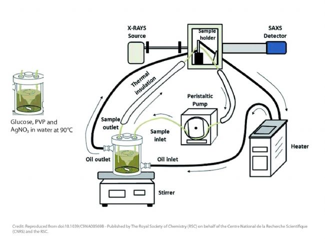圖 1:用于跟蹤具有原位SAXS表征的銀納米粒子形成的實驗示意圖。SAXS儀器是Xenocs的Xeuss 2.0,配備GeniX 3D銅靶光源和Pilatus 300K探測器。