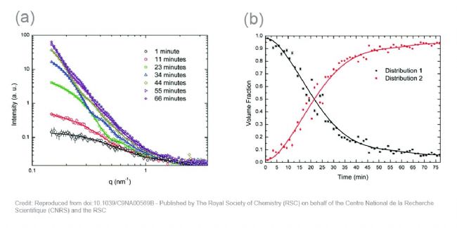 這個例子表明,原位SAXS分析銀納米粒子形成不僅能提供所形成粒子的尺寸和形狀的詳細信息,而且還提供了關(guān)于尺寸分布和形成機制的實時信息。這使得能夠通過淬滅反應(yīng)來控制合成結(jié)果。
