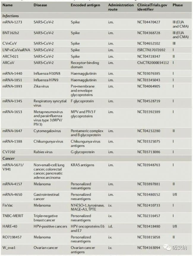 LNP-mRNA疫苗抗感染和癌癥的代表性臨床試驗(yàn)