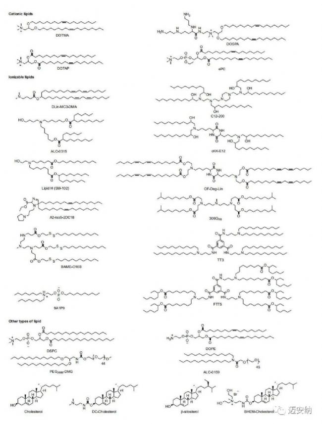 脂質(zhì)是一種兩親性分子,包含三個(gè)結(jié)構(gòu)域:一個(gè)極性頭基,一個(gè)疏水尾部區(qū)域和一個(gè)連接體。已被研究用于mRNA遞送的脂質(zhì)包括陽離子脂質(zhì)、可電離脂質(zhì)及其他一些類型的脂質(zhì)。