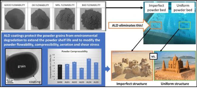 粉末冶金利用粉末材料鑄造型材,這對粉末材料的流動性和分散性有較高的要求。在粉末熔融的過程中,團(tuán)聚顆粒以及天然氧化層中的雜質(zhì)對于最終型材的質(zhì)量會有較大影響。通過 ALD 技術(shù)進(jìn)行粉末包覆后,材料的抗侵蝕,耐潮性,流動性有明顯改善,同時(shí)涂層成分的變化還可以賦予粉末功能,如改變其反射率,親水性等,擴(kuò)大應(yīng)用場景 [3]。