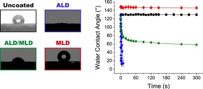 藥物粉末尤其是 API,通常為無定形或水合物狀態(tài),極易發(fā)生團(tuán)聚。通過 ALD 包覆,可有效改善其分散系和流動性,這對于吸入式藥物制劑的研發(fā)有重要的促進(jìn)作用。藥物親水性的調(diào)控對其在人體體液中的釋放有積極意義,而 ALD 只需幾個(gè)周期的涂層就可實(shí)現(xiàn)不同親水性或親油性的樣品包覆。